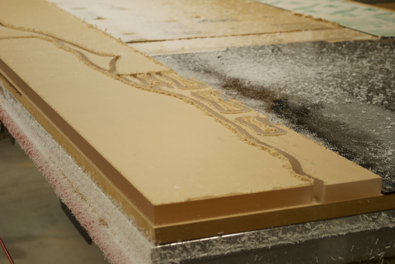 After everything had been cut, I used the table router to create the tongue and groove joints in the insulation foam, and assembled the table. Luckily I did so, because a few of the edges didn't align properly. Here is what happened: when a curved surface with a tongue must align with its mirrored grooved geometry, it must be offset to accommodate for the loss of material when the tongue is cut. I offset the material 1/4", but the only bearing for the bit close to 1/4" was 3/16", leaving on side of the material slightly too large. Luckily, this is cheap material and a quick fix.